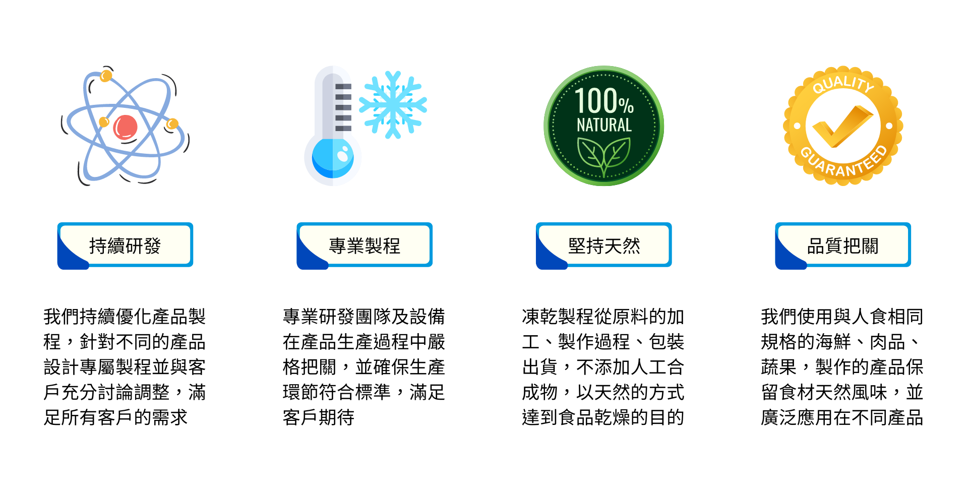 凍洋除了致力於凍乾技術上的優化,也注重和客戶間的合作,建立長久且穩固的關係。我們提供多元彈性的客製化服務,幫助客戶打造出獨一無二且值得信賴的產品。
